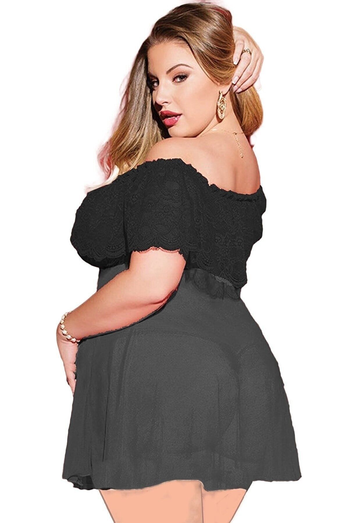 Kadın Siyah Dantel Detaylı Stringli Büyük Beden Fantezi Gecelik