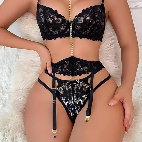 Kadın Siyah Dantel Ve Zincir Detaylı Gecelik İç Çamaşır Takım